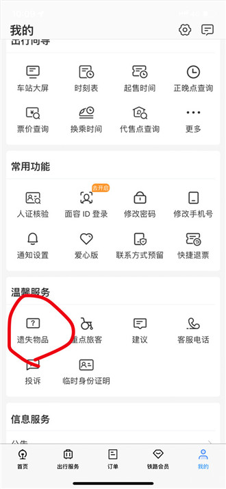 1、打开铁路12306app,在“我的”页面点击【遗失物品】。