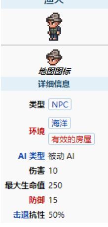 在第一次遇到渔夫时,他还是沉睡渔夫,随机睡在海洋生物群落的沙滩或水面上。当如下条件满足时他会搬进来: