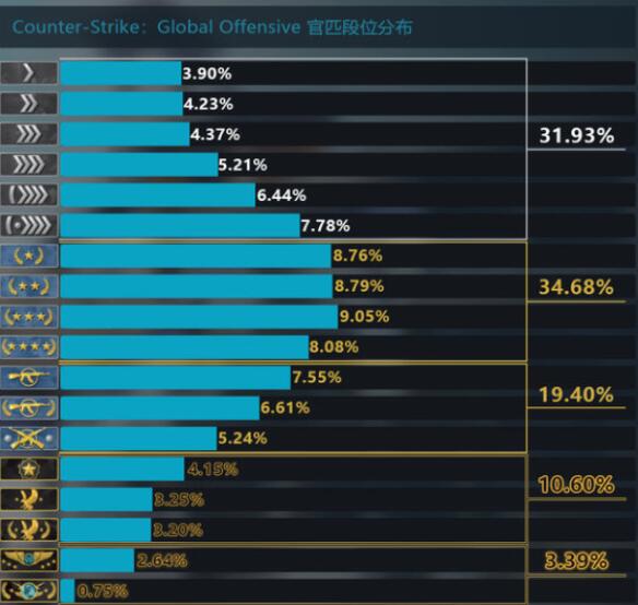 总结:黄金段位是很多CS:GO玩家一开始定级所处的等级,在这个等级里大部分人对CS:GO这款游戏已经有了比较正确的理解,基本上可以做到正确的武器选择和经济分配,不会出现白银局中买枪不买甲这样的事情。