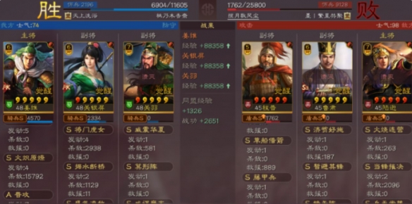 打虎臣弓由于有箕形阵以及盛气凌敌,太史慈和甘宁很容易被限制输出,最终一千出头的战损赢下。
