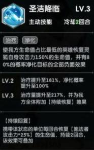 给我方最低占比生命值的英雄净化负面效果并且回血,满级给我方全体附加持续恢复的效果。