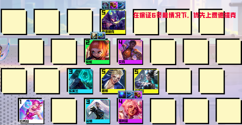 阵容组成:拉克丝、安妮、乐芙兰、娑娜、塔莉娅、艾克、迦娜、辛德拉、费德提克(9人口)