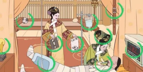 1、【气死大胖橘】关卡需要找出十处不和谐的地方,分别是:拖鞋、绿色毒药、大清人寿、四郎受伤、点滴瓶、X光片、足球、足球奖杯、心率图、皮带