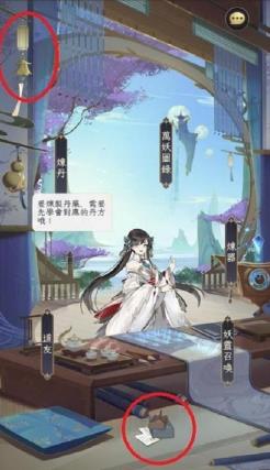 2.洞府页面的桌下箱子以及左上角有个风铃,图下红框所示(一次性奖励)