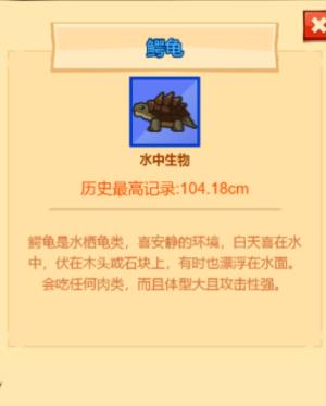 2、其次就是咱们的一个蓝色品质的代表钓物--鳄龟,鳄龟可以能够增加咱们的暴击属性,对于走暴击流的小伙伴们是不错的选择,此渔场中蓝色品质的钓物还有香鱼、西太公鱼、多鳍鱼、蜗牛、鳄龟,这个品质的鱼类对于鱼饵和钓具也都没有要求,可以直接上手钓就行。