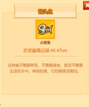 3、然后就是大家一直困扰的神奇现象种类的鱼--骨头鱼。骨头属于是金色品质的代表,同样金色品质的鱼还有锦鲤、霓虹鱼、骨头鱼。并且骨头鱼是属于小型鱼一类的,它能够给我们增加高额的攻击力以及防御力,关于钓具方面它最低要求是好像是需要蓝色品质的鱼漂,其主要是怕鱼跑掉,其他的钓具则没有要求。而鱼饵则需要用到咱们的“臭臭饵”,还好着鱼饵也不贵,只需要十颗钻石就可以买到十只,不过钓取难度是比较大的。反正小编的这条骨头鱼好像钓了将近300次才钓到的,说多了都是泪啊。