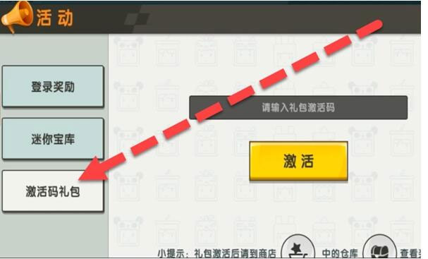 打开迷你世界,点击右上角的礼物盒,点击活动选项,点击激活码礼包按钮即可兑换!