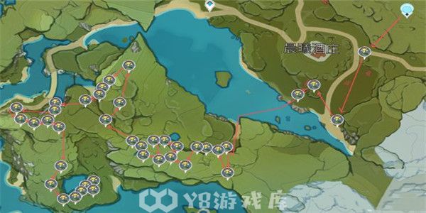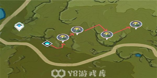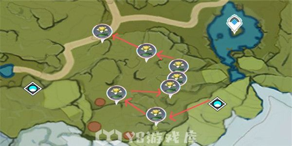 4、千风神殿甜甜花的位置分布并不是很聚集,玩家要采集的时候可以按照图中的路线行走,这里玩家可以获得10朵甜甜花。
