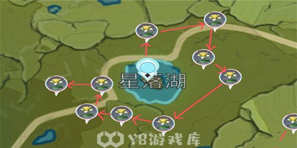 2、接下来就是星落湖,这里也分布了一些甜甜花,玩家按照小编提供的路线可以采集到9朵甜甜花。