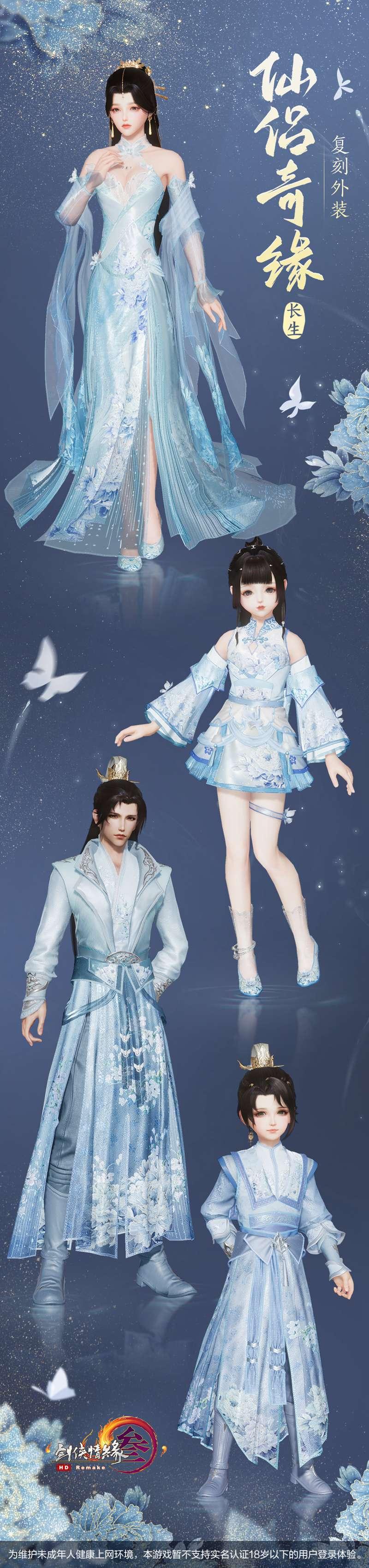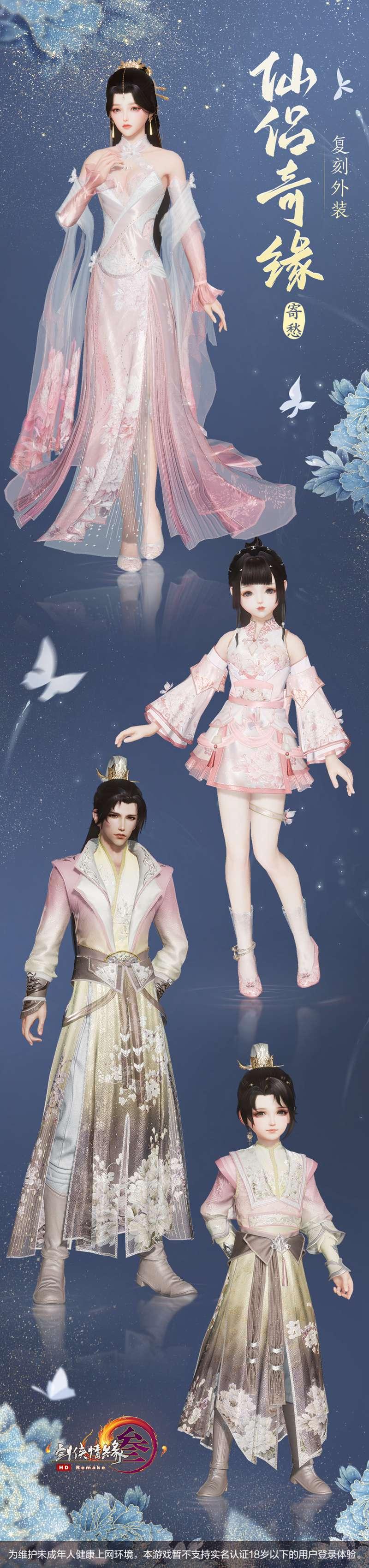以水为佩,以风为衣,侠士喜爱的经典外装仙女奇缘复刻焕新!成装潇洒,浅色外套暗纹隐现,更显绅士不凡;成年女装的仙女魅力飘渺,两缕丝绸自臂弯曲,裙摆用半透明薄纱遮住,别具优雅风格;萝莉款采用短裙设计,素缎与腰裙衬衫层叠,更显少女玲珑可爱;郑泰修身长衫更显少年仙子,整体设计简约大气,将劲装潇洒帅气!