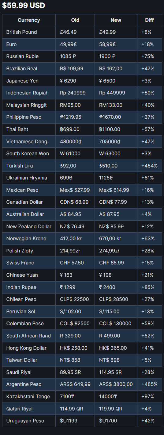 这项定价工具整合了当前Steam市场上39种不同货币,相比目前的价格涨幅也相当残酷。譬如一款售价为60美元的游戏,现在人民币的价格为198元(此前为163元)、中国香港地区为365港币(此前为258港币),阿根廷区则涨到了3800披索,相较于原来的649.99披索增长了485%。