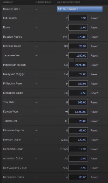 在开发者的游戏定价界面上,Suggest Pricing(推荐定价)的标签就是这项工具的入口,只要开发者输入了其定价的美元价格,剩下的货币就会按照当地购买力和当前汇率的评估自动生成,对于开发者来说,实际上是个相当便利的工具。