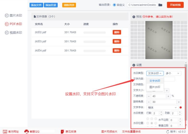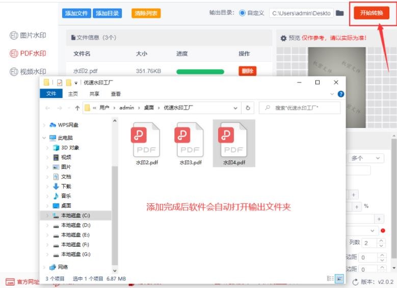 步骤3,完成设置后就点击【开始转换】按钮,启动软件程序。完成后软件会自动打开输出文件夹,所有加好水印的pdf文件会全部保存在这里。