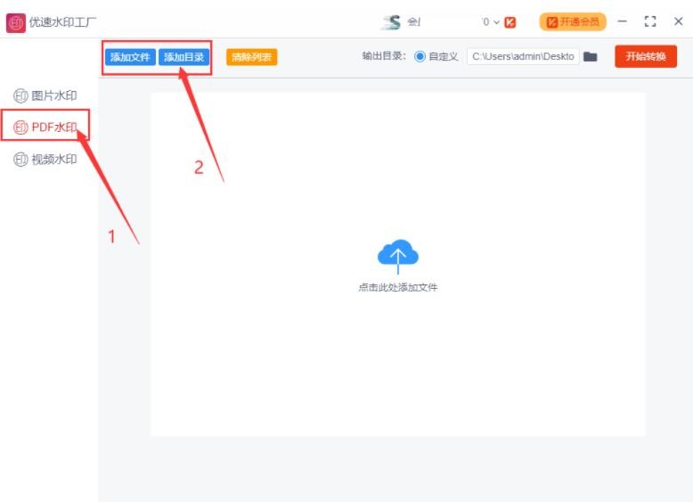 步骤1,电脑上先下载“优速水印工厂”软件,然后安装并打开使用。选择左边中间的【pdf水印】功能,再点击【添加文件】按钮,将所有需要添加水印的pdf文件导入到软件中,也可以点击【添加目录】按钮,可直接将一个文件夹中的所有pdf添加到软件。