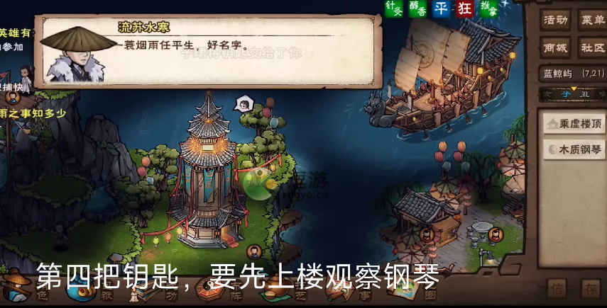 4、第四把钥匙:(7,21)先上乘虚楼观察钢琴,再去找子珺打听,约好后子时乘虚楼上楼弹琴