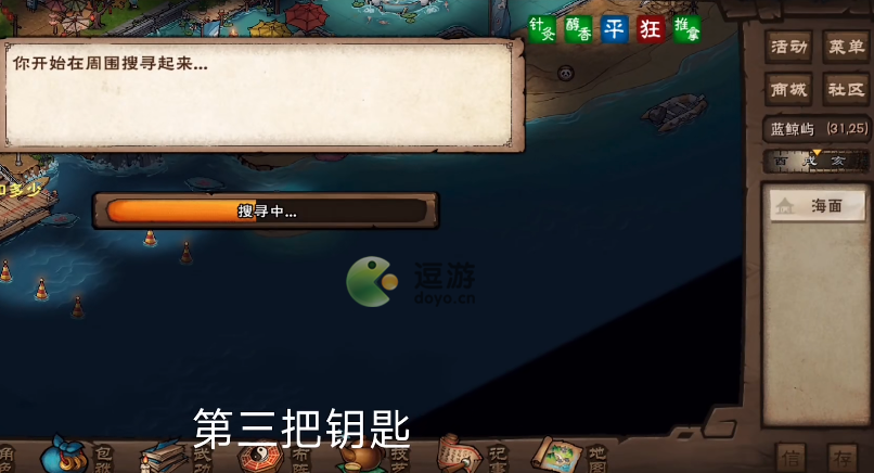 3、第三把钥匙:(27,30)找鲨鱼辣椒打听,然后跳到(31,25)搜索一次、铁铲挖一次,找到第三把钥匙
