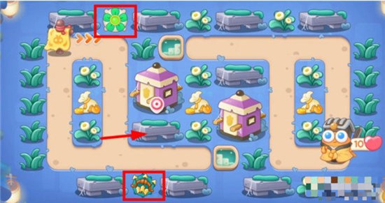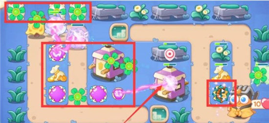2.打掉后,在左上方的位置放一个风扇塔,多重箭拆除附近的道具,拆除顺序如下图: