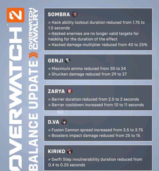补丁内容主要包括部分英雄的削弱:黑影的伤害降低,伤害系数降低从40%降低至25%,在效果持续时间内,被黑客入侵的敌人也不能成为黑影攻击的目标;源氏手里剑的伤害降低,弹容量削弱至24;毛妹的护照持续时间降低,冷却增加......具体参照下图: