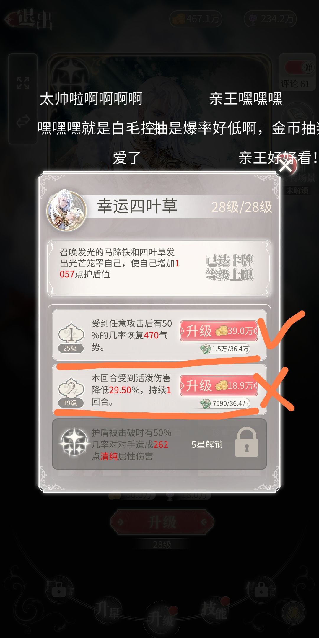 升级无属性的技能,比如这张《马背上的亲王》,主技能是加护盾,主升它没问题,但是技能2是“受活泼伤害减少”,尽量别升,技能1是“有几率恢复气势”,没得升的话可以升。