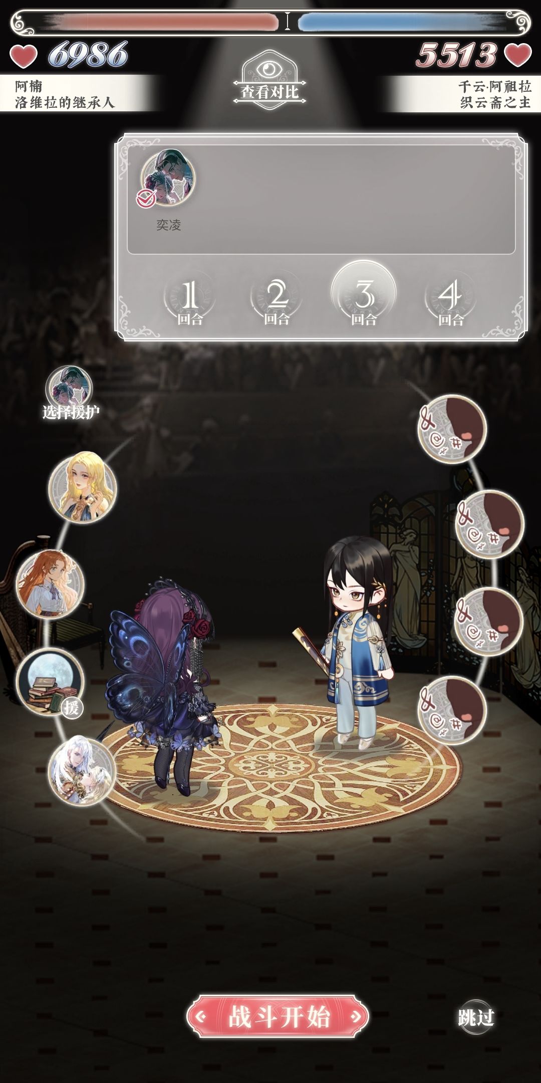 ④在舞会开始有交流的就去跟他交流,然后选加护盾效果(大部分是,如果没过再试试加伤害),然后再去打主线,主线打完再打支线。先过关要紧,过关之后凑够就能修建庭院,然后才会升级,升级的话气势和护盾都会提高。