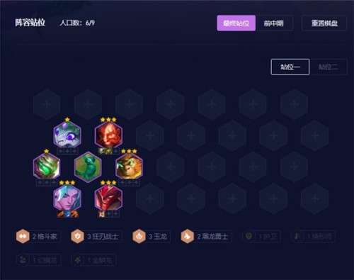 中期3-2拉6级大搜一波,在2护卫2狂战的基础上,可以临时上3玉龙,也可以上3个狂战,搜完之后就要锁连胜。这里注意,6级和7级要大搜两波,6级搜的时间相对较短,从3-2大约搜到4-2左右就够了,布隆和永恩拿到6到7只就够了,不用在6级强行追3星。上到7级之后,持续大搜一波,优先给永恩和奥拉夫追3星,其次是猴子、洛和布隆,其余没必要追3星。这些全部追3星之后,在5到6阶段决赛圈才能上8级,在 8人口单挂巴德即可大成型。