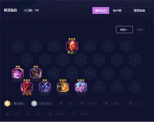 目前为止4狂战阵容有两套打法,其一是4狂战4屠龙奥拉夫,其二就是上图中的3星永恩,也是优先推荐的阵容,因为屠龙奥拉夫有一定的局限性,必须2阶段拿到奥拉夫才能养攻击力,其次是之前的热补丁中削弱了奥拉夫的攻击加成,对综合强度有一定影响。