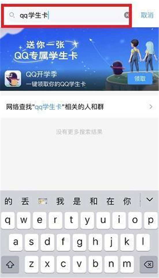 1、首先打开QQ,在搜索框里输入“QQ学生卡”,出来QQ开学季,点击“领取”。