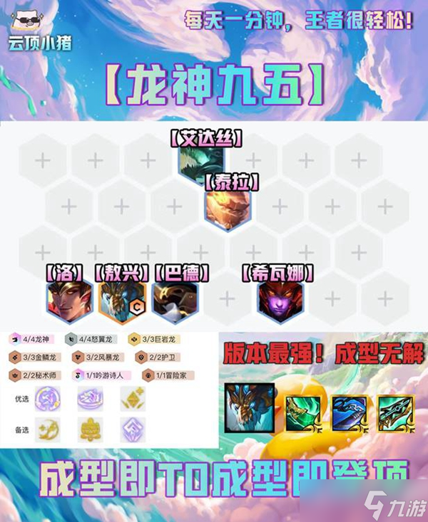 前期没有特别固定的思路。一切以连胜和保血量为主,上不了9这阵容就是空弹,8人口高费龙很难二星。