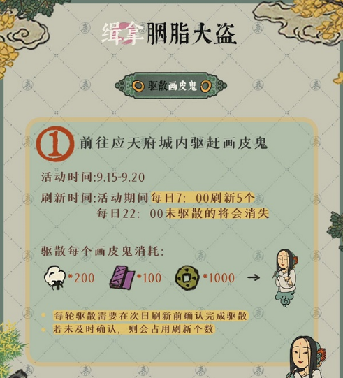 最新的手游攻略教程 缉拿胭脂大盗活动玩法介绍!我们小编对比:江南百景图游戏中每个时间段都有不一样的活动,可以让玩家们去参加,完成这些活动任务就可以获得大量的奖励。这不江南百景图缉拿胭脂大盗活动上线了,玩法和上次的桃妖类似,每天刷新5个画皮鬼,玩家驱赶过后一定要记得点一下完成,下面小编就给大家详细的介绍一个这个活动的玩法和奖励,一起来看看吧。