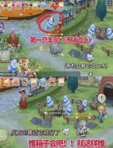 用推箱子的方法,移动自身靠近羊驼把它慢慢的往羊圈方向推进~进圈后就可以啦~