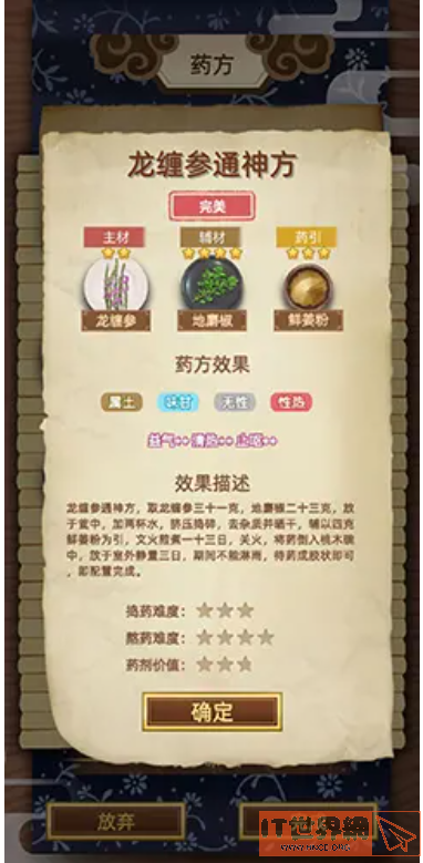 【普通】金乌藤散「安神++」药方:金乌藤+马玉+火金粉,药方效果:属土 味甘 阳性 性凉,主治:喜怒无常,多发噩梦【普通】洛阳散「驱虫++」药方:石天阳,药方效果:属火 味辛 阳性 性温,主治:寄生虫所致面色萎黄,善饥多食,注意事项:多收集四星主材,尽量搭配五行、功效相近的,完美药方不难出,简单类:益气+/益气++,主材:一星灵芝盖/血玉参/龙缠参,辅材:无,药引:土属性即可【注:有一定几率会是劣质药方,这个不影响药效】安神++,主材:-星金乌藤【土】/辰珠【火】辅材:无,药引:粥凝【土属性即可】/童子尿或海布【火)平喘+,主材:一星旋覆金盏,辅材:无,药引:童子尿或海布【注:不能用白马追和无根水】