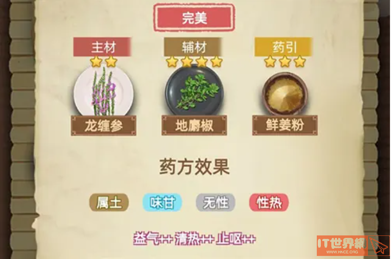 药方攻略:【强效】穿心剑两仪汤「清热+止呕+」药方:穿心剑+滑菜+井水,药方效果:属水 味苦 阴性 性寒,主治:唇焦咽燥,舌肿喉闭;食火胃热,消化不良,【普通】龙缠参阳明方「益气++补血+」药方:龙缠参+黑武实+酵酸浆,药方效果:属土 味甘 无性 性寒,主治:虚弱无力,易疲倦;外伤、内伤等失血过多【强效】海楼石汤「止咳++平喘+」药方:海楼石+红映山+火金粉,药方效果:属火 味咸 阴性 性凉,主治:咽喉干痒,咳嗽不止;胸闷气短,呼吸困难