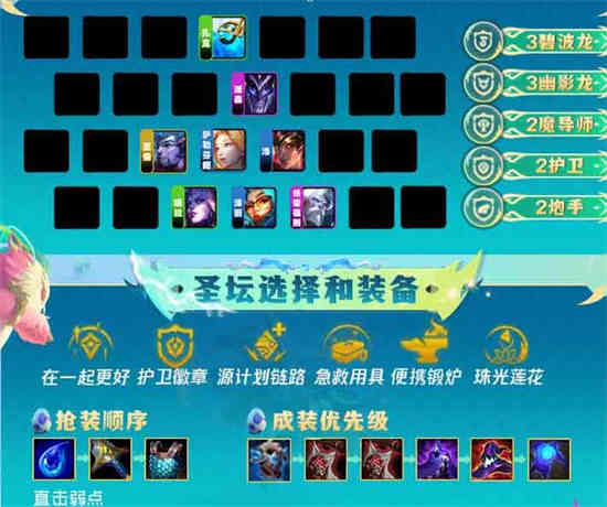阵容思路:前期利用三碧波刷装备,前期可以合成圣盾、基克或鬼书保血。