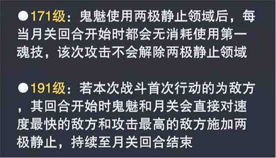 11级可对非竞技副本中的非首领目标造成100倍伤害12级可对两极静止中的敌方造成100%的增伤,且对方每有1回合【重伤】则可额外提升5%受伤,最高200%,联系到初始的100%就是合计最高300%的受伤提升13级可提供在鬼魅主导使用武魂融合技后,月关回合开始时他都会无消耗使用1技能来对敌方进行攻击,且该次技能使用并不会打断【两极静止领域】14级可提供战斗中若敌方抢到先手,则其回合开始时菊鬼会对敌方速度最快和攻击最高的两位敌人施加【两极静止】,这个效果持续到月关回合结束