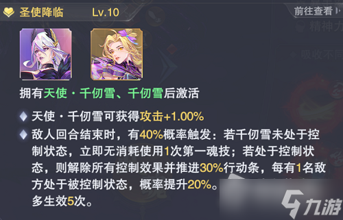 1、首先是可以在1回合或2回合便通关的极速阵容,其输出的核心是老版本千仞雪,其中输出逻辑维依靠千仞雪的羁绊关系【圣使降临】,其中写明了敌人回合结束时,老版本千仞雪有40%的几率触发无消耗使用1技能攻击敌方(前提是千仞雪不在控制状态),所以大家的千仞雪练度足够的话是可以在1-2回合便便将敌人给反击掉的,另外特别提醒,这个打法不需要我们拿一速,请让敌人先动。