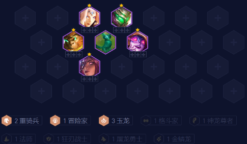 3玉龙+重骑前期很强势,尤其是有日炎的时候,可以其他强势阵容开,比如2黯灵+2重骑+其他c