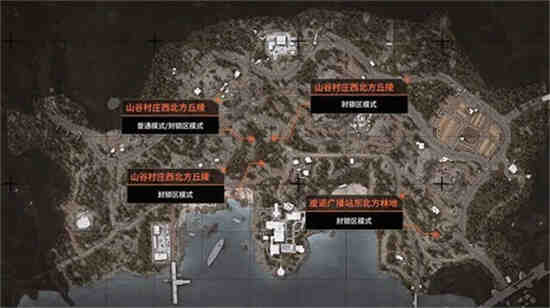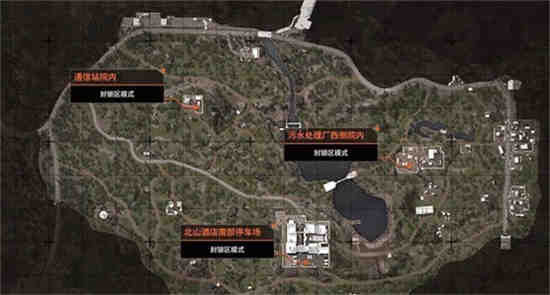 3、北山,普通模式中没有空投罐,在封锁模式中有三个,分别在通信站院内,北山酒店南部停车场,还有污水处理厂西侧院内;