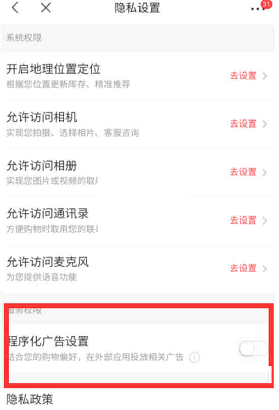 4、接着在最下方可以看到程序化个性广告设置,点击关闭按钮。