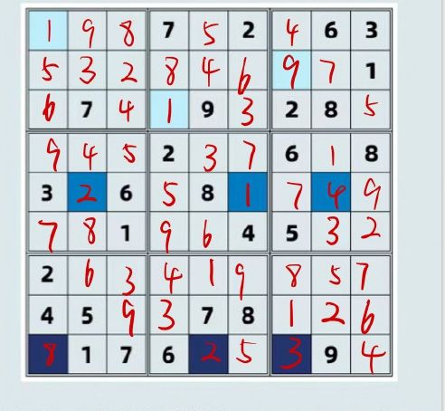 2、填写完成以后的数独图如图所示,三组数字是119、214以及823。