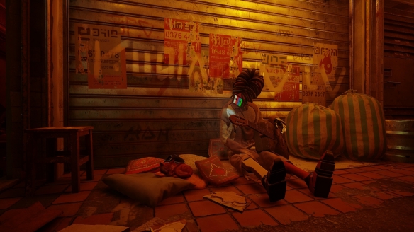 转身往回走,餐厅对面的路中央有个蓝色的全息投影,进入投影后边的路,走楼梯下来后右拐进入小巷,跳到右侧的平台上,再跳到墙边的空调箱上,一直向前走,走到小巷尽头后再沿着空调箱往上跳,在橙色管道旁有个小窗户,进入后会发现一个死去的机器人,互动后可以拿到警察徽章。