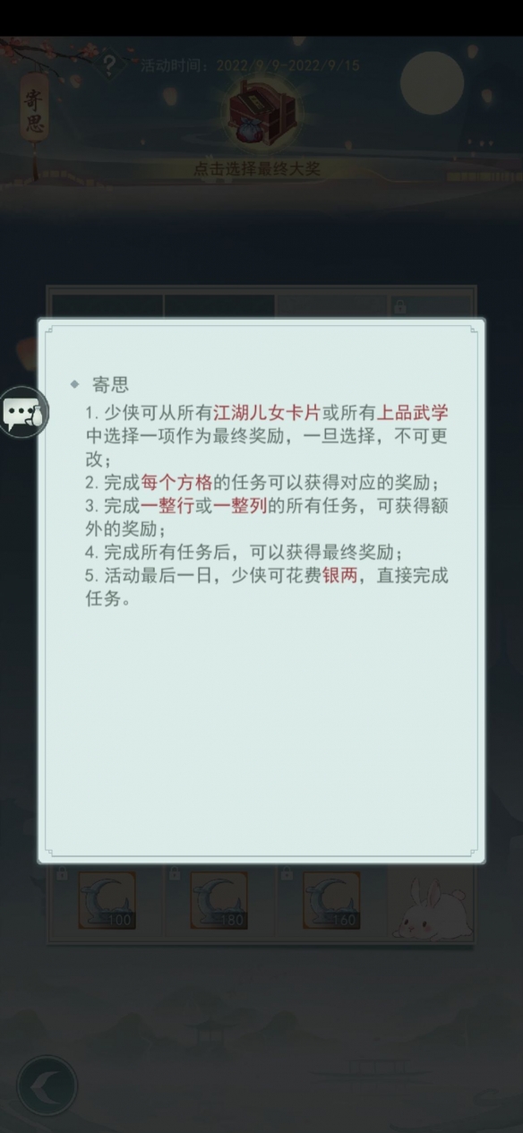所以本关卡可获得440+880=1320皓月玉+自选结缘卡。以上就是小编为大家带来的有关于江湖悠悠九天揽月寄思任务完成攻略分享的全部内容。各位小伙伴如果想要了解更多,欢迎继续关注我们!