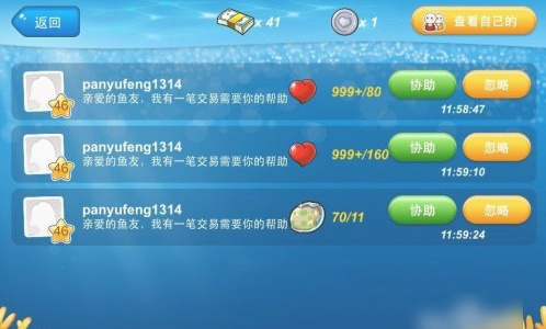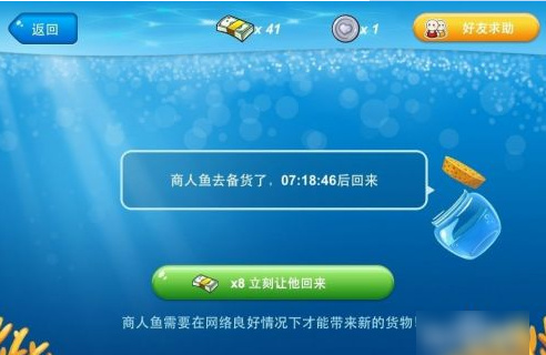 2.有两种类型的交易和无限时间。如名如姓,限时交易必须在规定时间内交易商家和人鱼需要的东西,不能过期交易。比如换鲸需要80爱,不够爱可以向朋友申请帮助。每天有3次机会问好友3次,每次可以同时问5个好友。