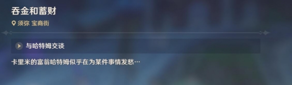 首先需要在须弥接到一次吞金和蓄财的每日委托,接取后,根据给予的食物不同,与期货状态的不同,有两种后续,两种后续均有隐藏成就。
