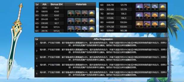 2、武器特效:装备后每10秒,根据持有者的元素精通每点提升0.052%元素充能效率,基于该提升的30%为队伍中附近的其他角色提升元素充能效率,持续12秒。该状态在角色处于后台时也可以生效,且可以叠加。