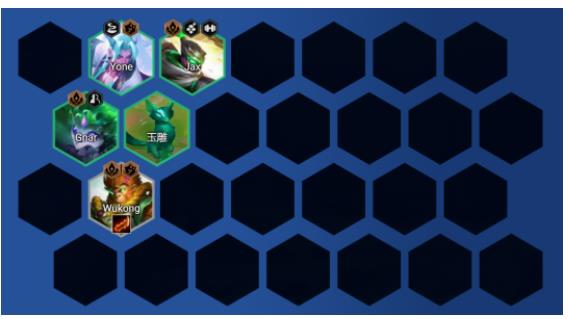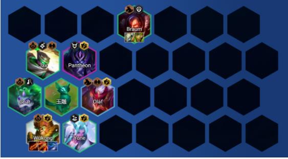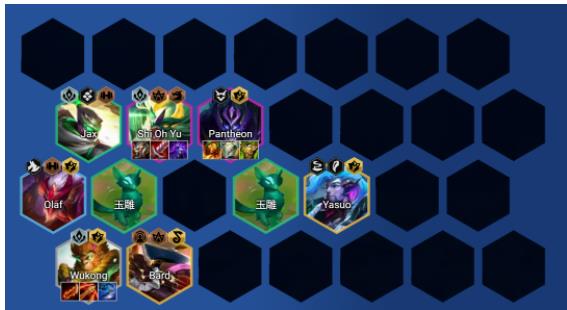 棋子构成:从上倒下从左到右依次为:贾克斯、石傲玉、潘森、奥拉夫、亚索/永恩、孙悟空(追3星)、巴德