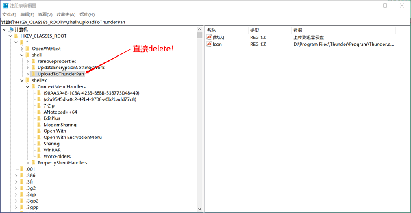 二、计算机\HKEY_CLASSES_ROOT\*\shell\UploadToThunderPan右键它然后删除。