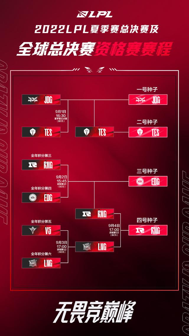 JDG与TES在2022LPL夏季赛总决赛中会师,凭借积分提前锁定LPL赛区一号种子和二号种子的席位。在9月2日至9月4日的资格赛中,EDG让二追三战胜RNG,率先拿下了三号种子资格。最后一个席位的争夺战在RNG和LNG之间展开,RNG先下两城,随后被LNG连扳两局,好在让二追三的历史没有重演,最终RNG以3比2战胜LNG拿下最后一个全球总决赛席位。