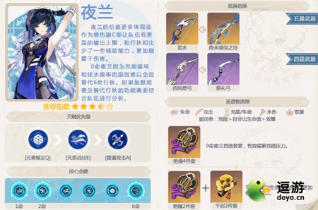 1.夜兰是后台增伤副C,优势在于自身不错的输出能力和可观的增伤能力,还有和行秋类似的功能性,有着很广阔的组队前景。