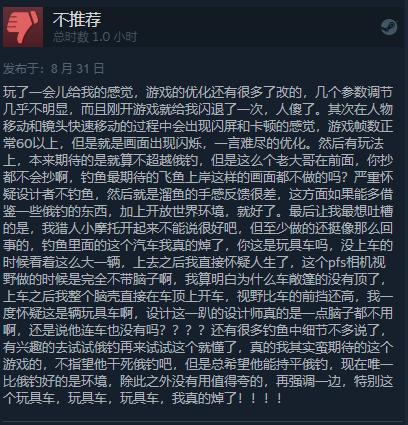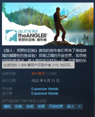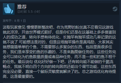 本作的开发商于2017年发布了特别好评的狩猎模拟游戏《猎人:荒野的召唤》,但新作却让玩家大失所望,有人评价说:不如在前作里加入钓鱼功能。不少玩家指出,《垂钓者》优化差、画质粗糙,BUG频出,与5年前的前作相比都十分逊色。在玩法方面,溜鱼手感不好,钓鱼没有任何互动性,就是扔饵,罚站,上鱼。还有小部分玩家看在《猎人》的高品质上给了好评——希望开放商能尽快整改提升。
