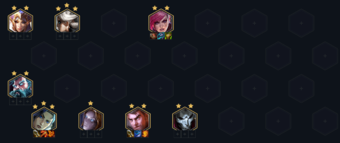 这套阵容的策略的是连败五级赌女警和卡蜜尔,二阶段不升级开3约德尔摆烂,打精致连败攒经济,2-3自然四人口,上一张女警,尽量稳血保证五连败到石头人。如果来牌质量高,也可以连胜运营速八找杰斯C。